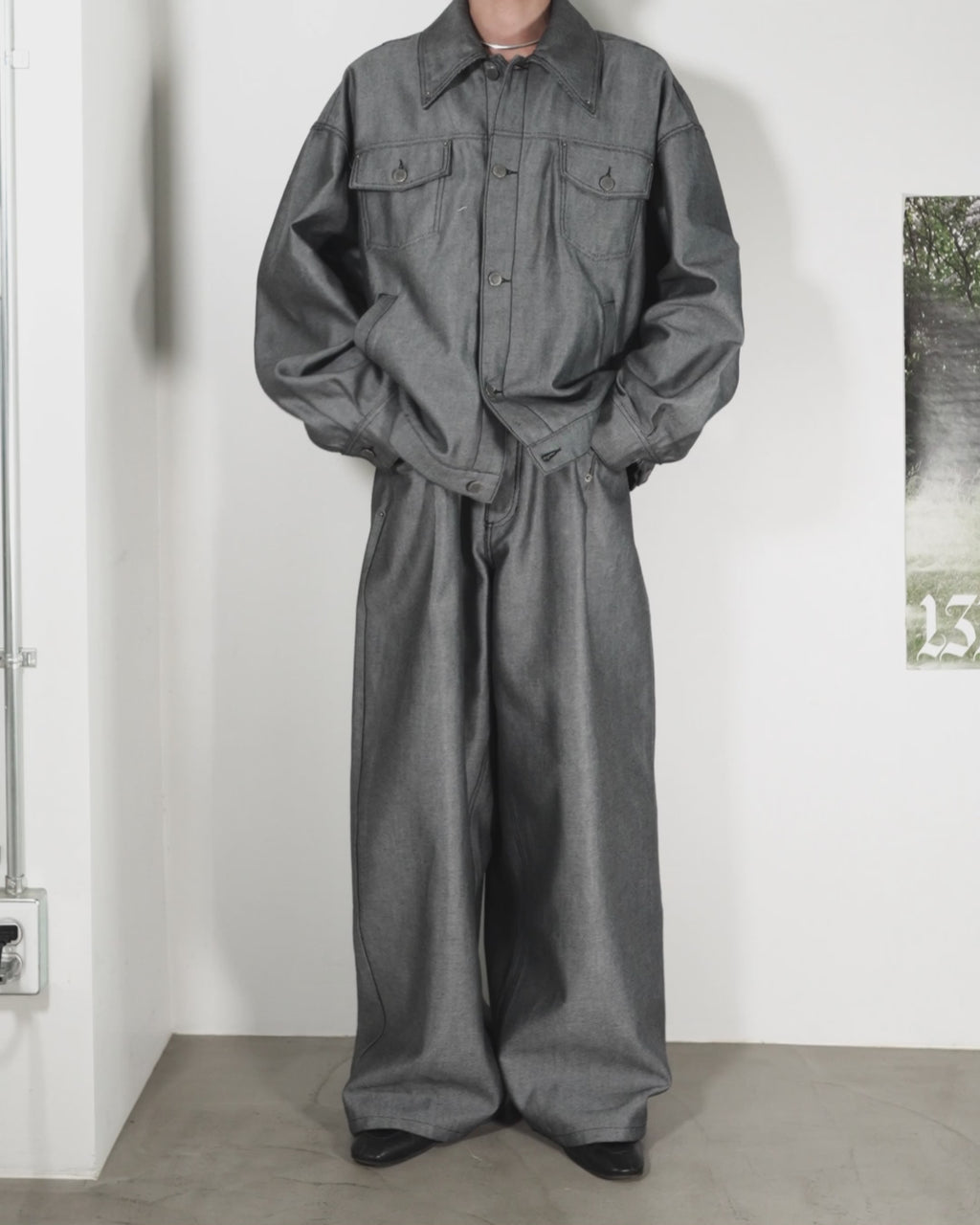 26SS新作。【1313 SELAH】。生地の裏面を使用したシャイニーシルバーデニムパンツ。 エクストラワイドレッグシルエット。 “13”刻印入りのエイジドシルバーリベットとシャンクボタン。 PUレザーパッチにはブラインドエンボスの1313 SELAHロゴを配置。