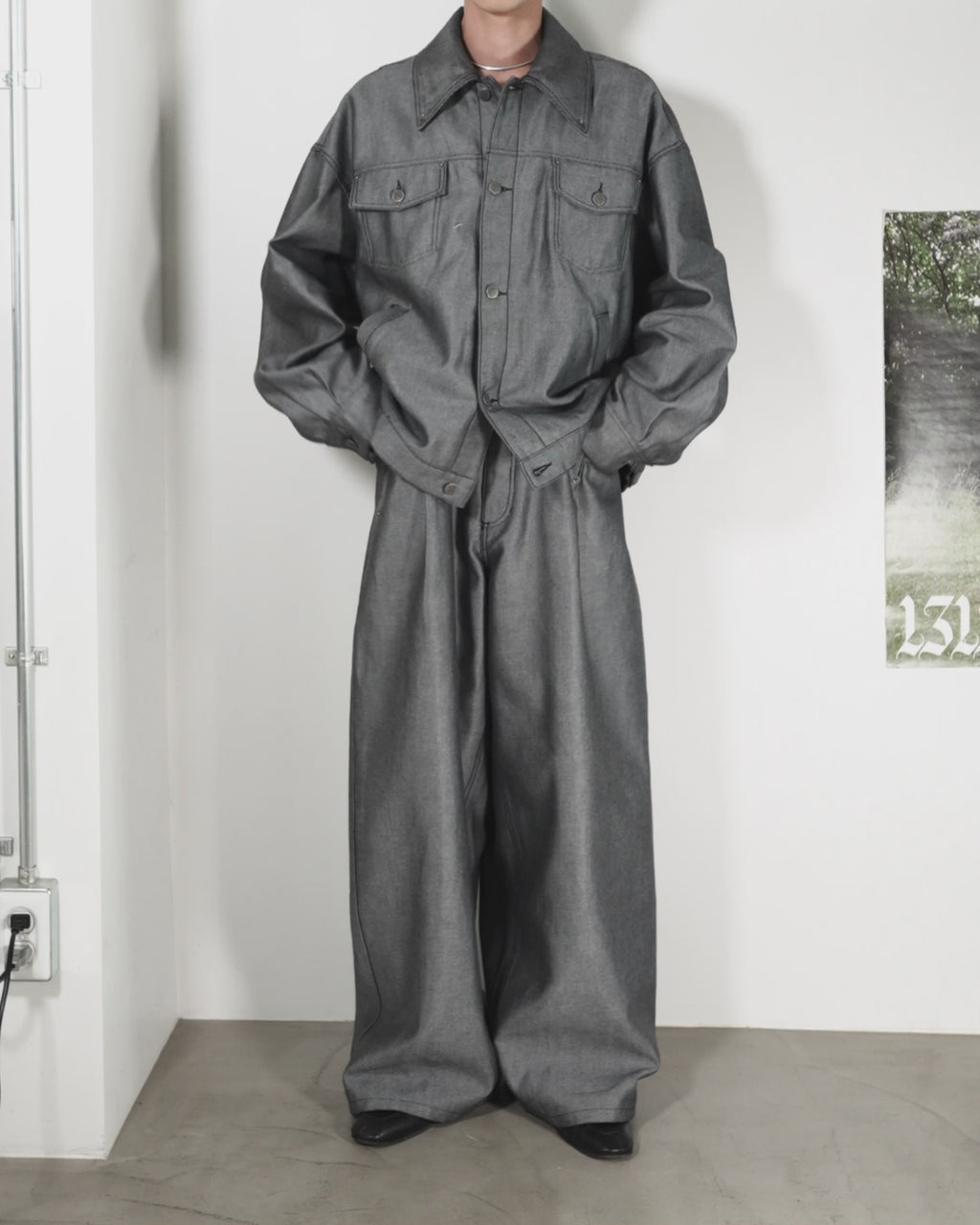 26SS新作。【1313 SELAH】。シャイニーシルバーデニムを使用したデニムジャケット。 ややクロップド丈のオーバーサイズシルエット。 ポケット口や襟先、背面プリーツに“1313”刻印リベット。 背面にはインバーテッドクロスプリーツを配し、立体感を強調。 裾には1313 SELAHロゴ入りPUレザーパッチ。
