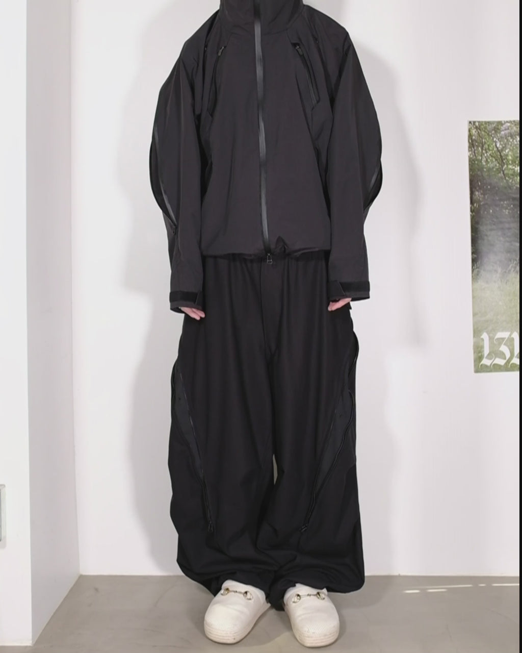 ウエストゴム、ドローコード、ベルトループ。ジッパーフライ。サイドフラップポケット。ヒップから脛にかけて開閉式ベンチレーション。ベンチレーション内にヒップポケット。ニータック。裾ドローコード。