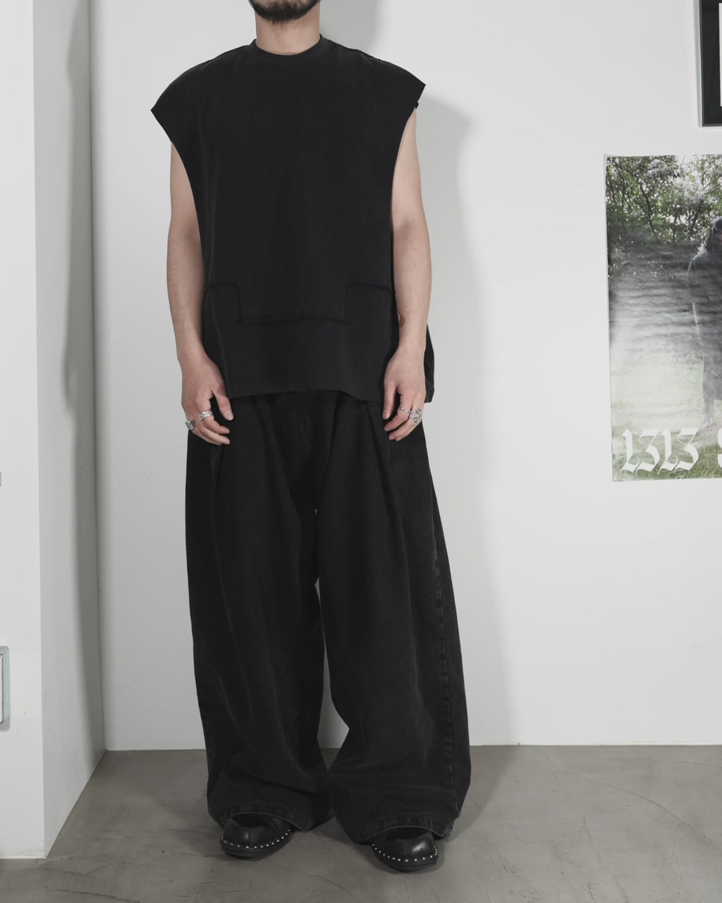 26SS新作アイテム。定番のCASTLE Tを大胆にノースリーブへと再構築した、存在感のあるカットオフトップ。袖から脇腹を断ち切ったようなラインが特徴で肩に自然なボリュームを持たせつつ、アームホールはかなり広く設計されています。ヨークで中世建築の凹凸を表現する事で、ブランドらしさを演出し、唯一無二のデザインに。