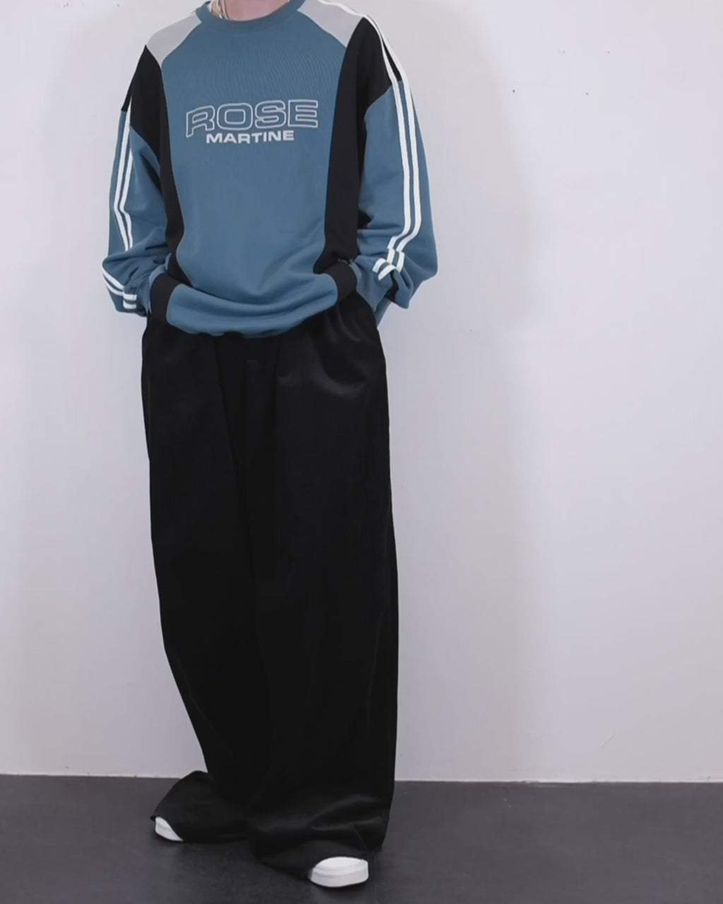 パネル仕立てのスウェットシャツ。フロントに「ROSE MSRTINE」のボンディング加工ロゴ。ネックから袖にかけてラインのアクセント。クルーネック、袖口、裾にリブ。