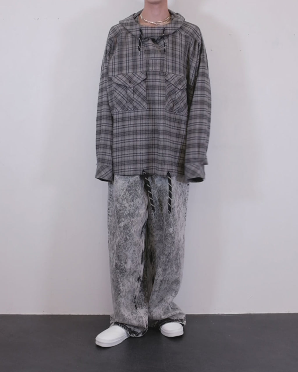アシッドウォッシュを施したデニムパンツ。ジッパーフライ、飾りボタン。ベルトループ。サイドポケット、コインポケット、ヒップポケットの5ポケット仕様。コインポケットにラベル。レザーパッチ。